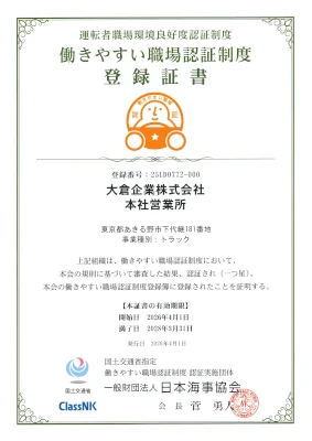この度、大倉企業株式会社は「働きやすい職場認証制度(一つ星)」の登録更新をいたしました。