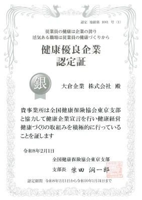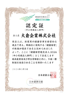 本制度は、経済産業省と日本健康会議が共同で、特に優良な健康経営を実践している法人を顕彰するものです 。当社は、従業員の健康管理を経営的な視点で考え、戦略的に実践する「健康経営」の取組が優良であると認められました。 今後も一層、従業員一人ひとりが心身ともに健康でいきいきと働ける職場環境づくりと、健康経営の継続的な推進を通じて、企業価値の向上に努めてまいります。